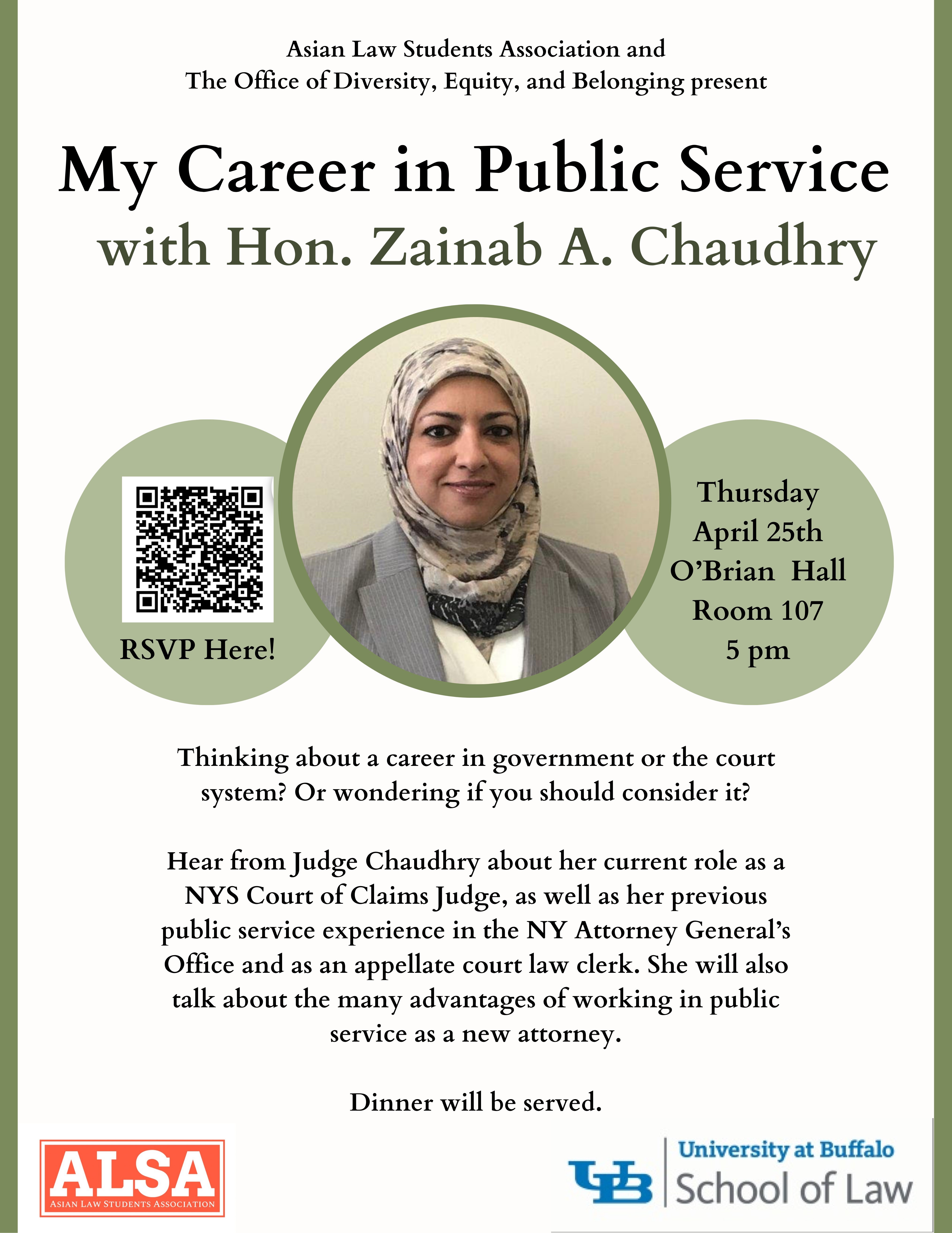 Please joins us as we welcome the Honorable Zainab Chaudhry this Thursday, April 25th at 5:00 P.M. Judge Chaudhry is a first-generation lawyer and the first Muslim appointed to the NY Court of Claims. She will share her unique experience in public service. All are welcome.