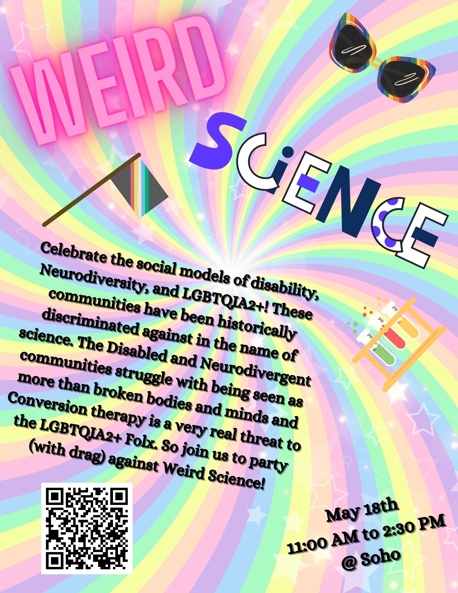 Celebrate the social models of disability, Neurodiversity, and LGBTQIA2+! These communities have been historically discriminated against in the name of science. The Disabled and Neurodivergent communities struggle with being seen as more than broken bodies and minds and Conversion therapy is a very real threat to the LGBTQIA2+ Folx. So join us to party (with drag) against Weird Science! This event will be hosted on Saturday, May 18th from 11 to 2:30 at SoHo (64 W. Chippewa).