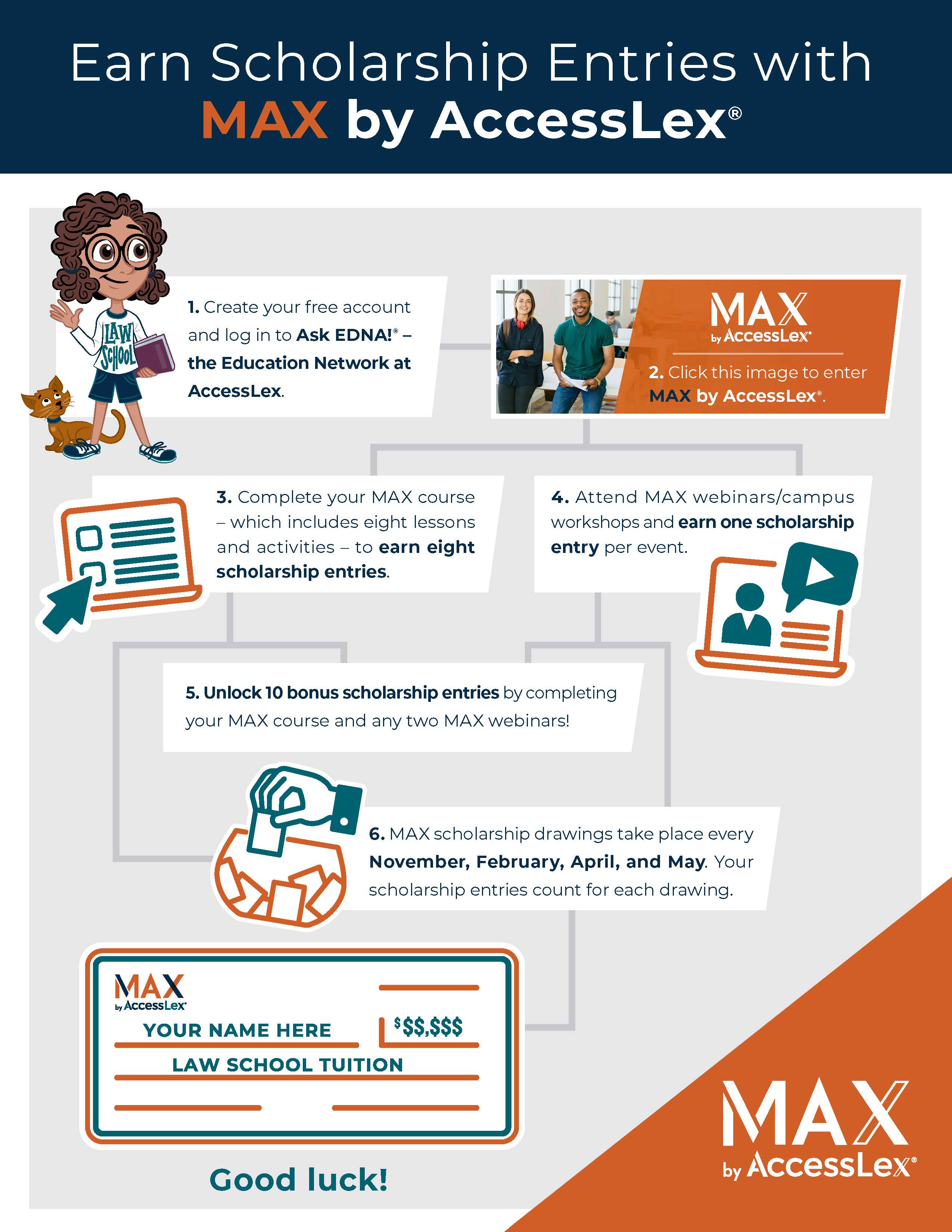 Please view the attached flyer/infographic to learn more about how to use MAX to master your money while in law school and earn scholarship entries for completing lessons and attending webinars. Then, activate your Ask EDNA! law student account and knock out your Financial Foundations course now.