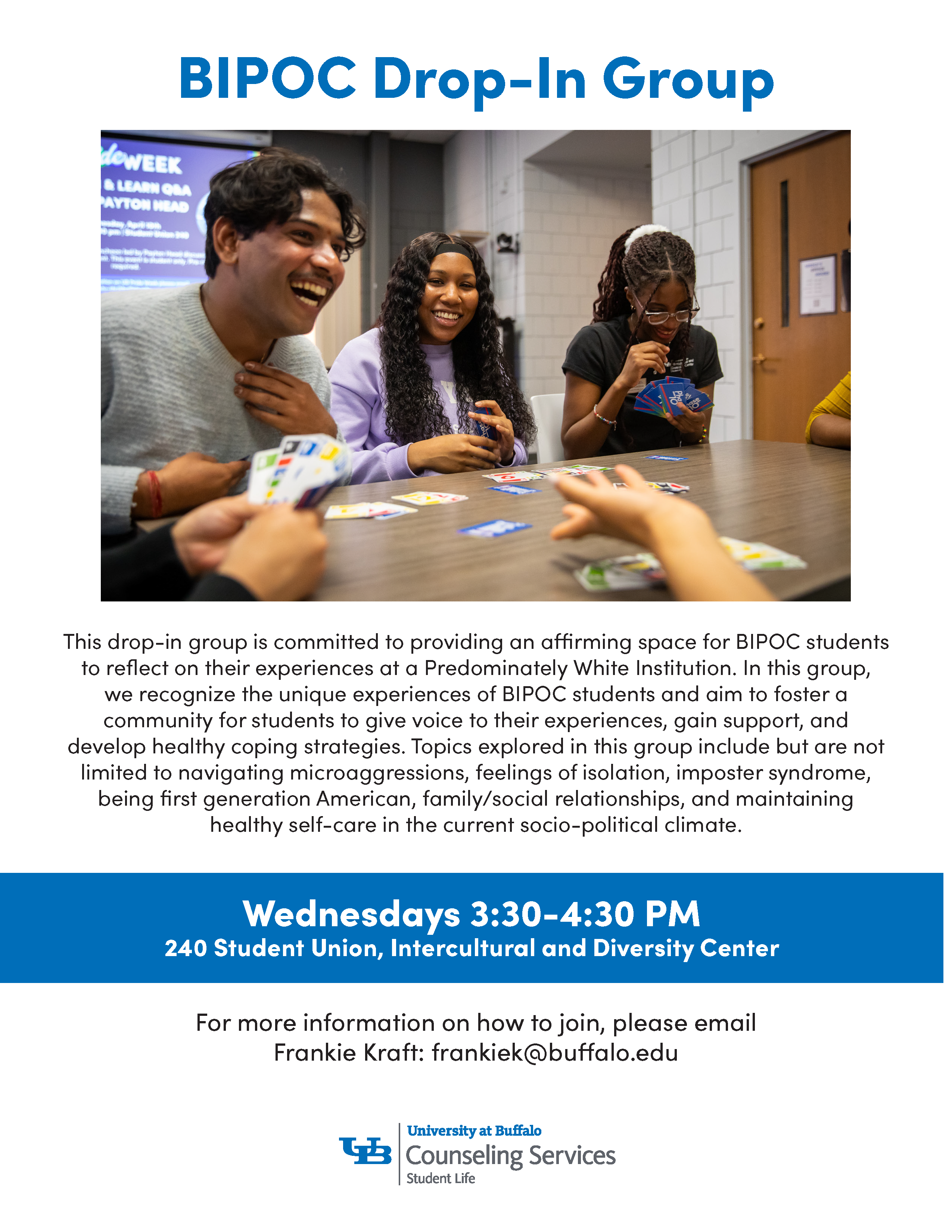 Please see attached flyers for weekly drop-in groups hosted by University at Buffalo Counseling Services and Intercultural Diversity Center.