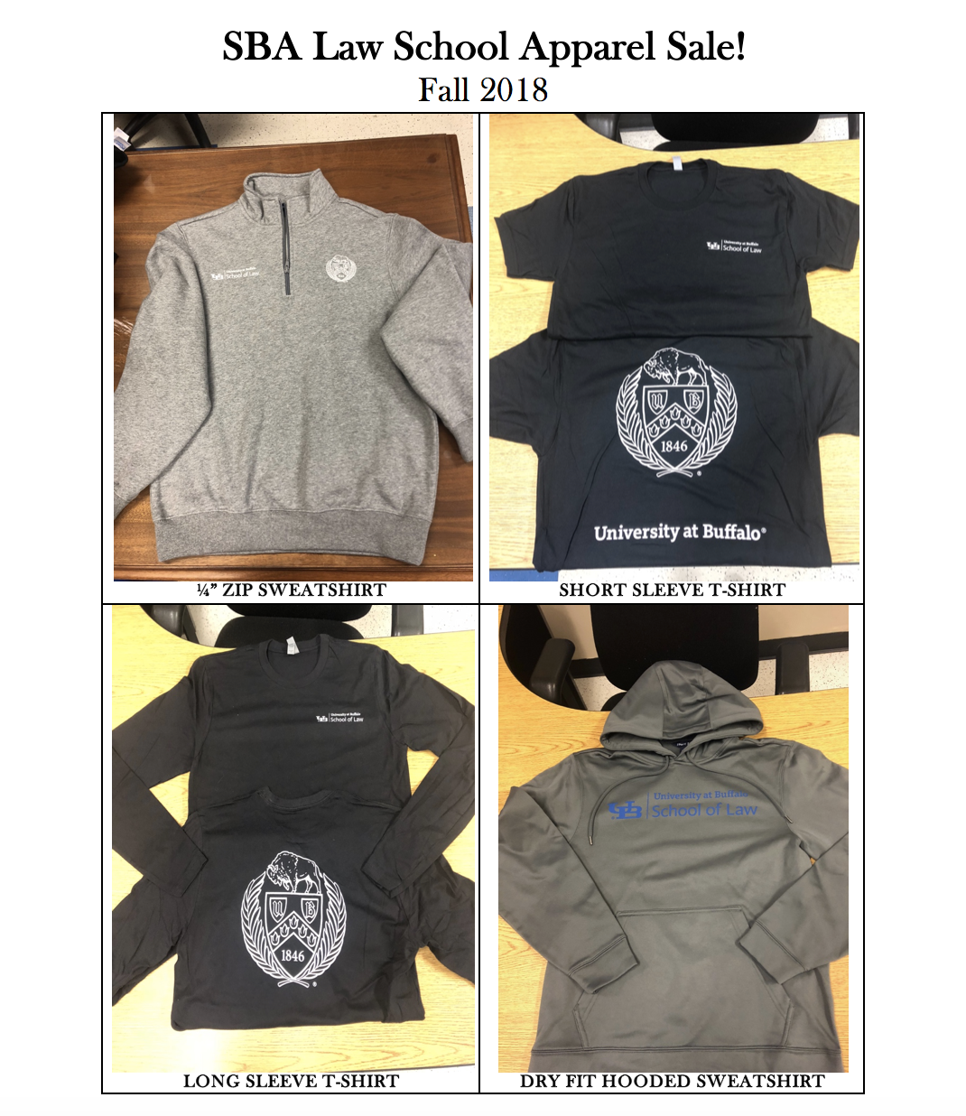 The Student Bar Association will be hosting a law school apparel sale!