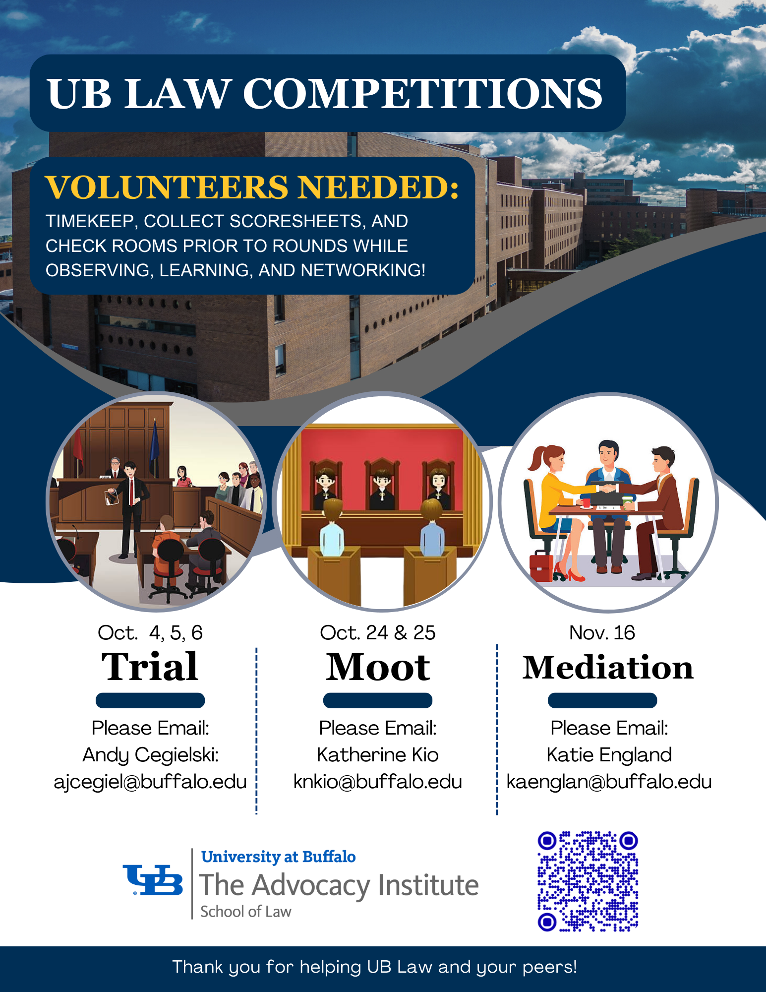 Volunteers needed for UB School of Law Competitions (timekeep, collect score sheets, and check rooms prior to rounds) while observing, learning, and networking!