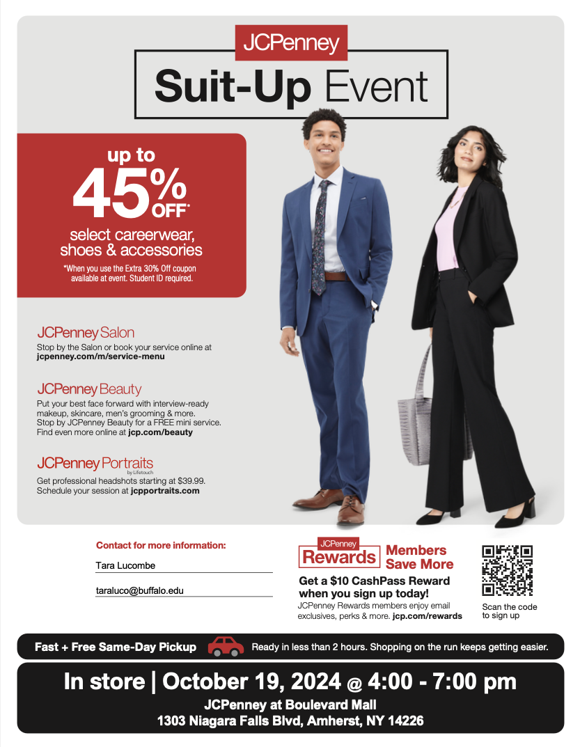If you are in need of professional clothing for an upcoming interview or summer internship come shop with us at JCPenney on October 19th and receive up to 45% off on select careerwear and more.