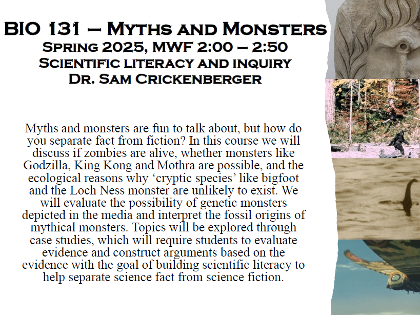 Myths and monsters are fun to talk about, but how do you separate fact from fiction? In this course we will discuss if zombies are alive, whether monsters like Godzilla, King Kong and Mothra are possible, and the ecological reasons why ‘cryptic species’ like bigfoot and the Loch Ness monster are unlikely to exist. We will evaluate the possibility of genetic monsters depicted in the media and interpret the fossil origins of mythical monsters. Topics will be explored through case studies, which will require students to evaluate evidence and construct arguments based on the evidence with the goal of building scientific literacy to help separate science fact from science fiction.
