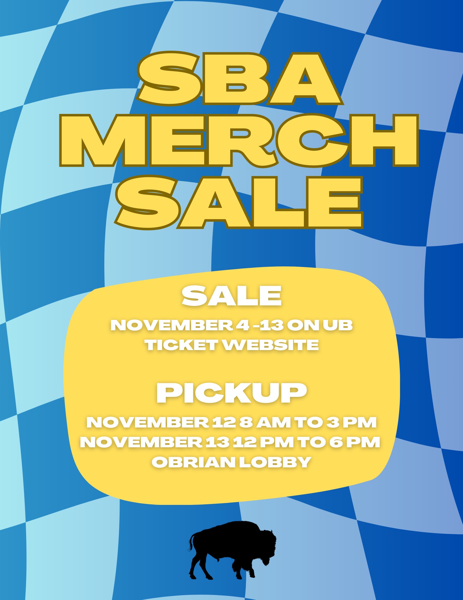 Merchandise can be picked up in the O'Brian lobby on Tuesday, November 12, from 8 a.m. to 3 p.m. and Wednesday, November 13, from 12 p.m. to 6 p.m.