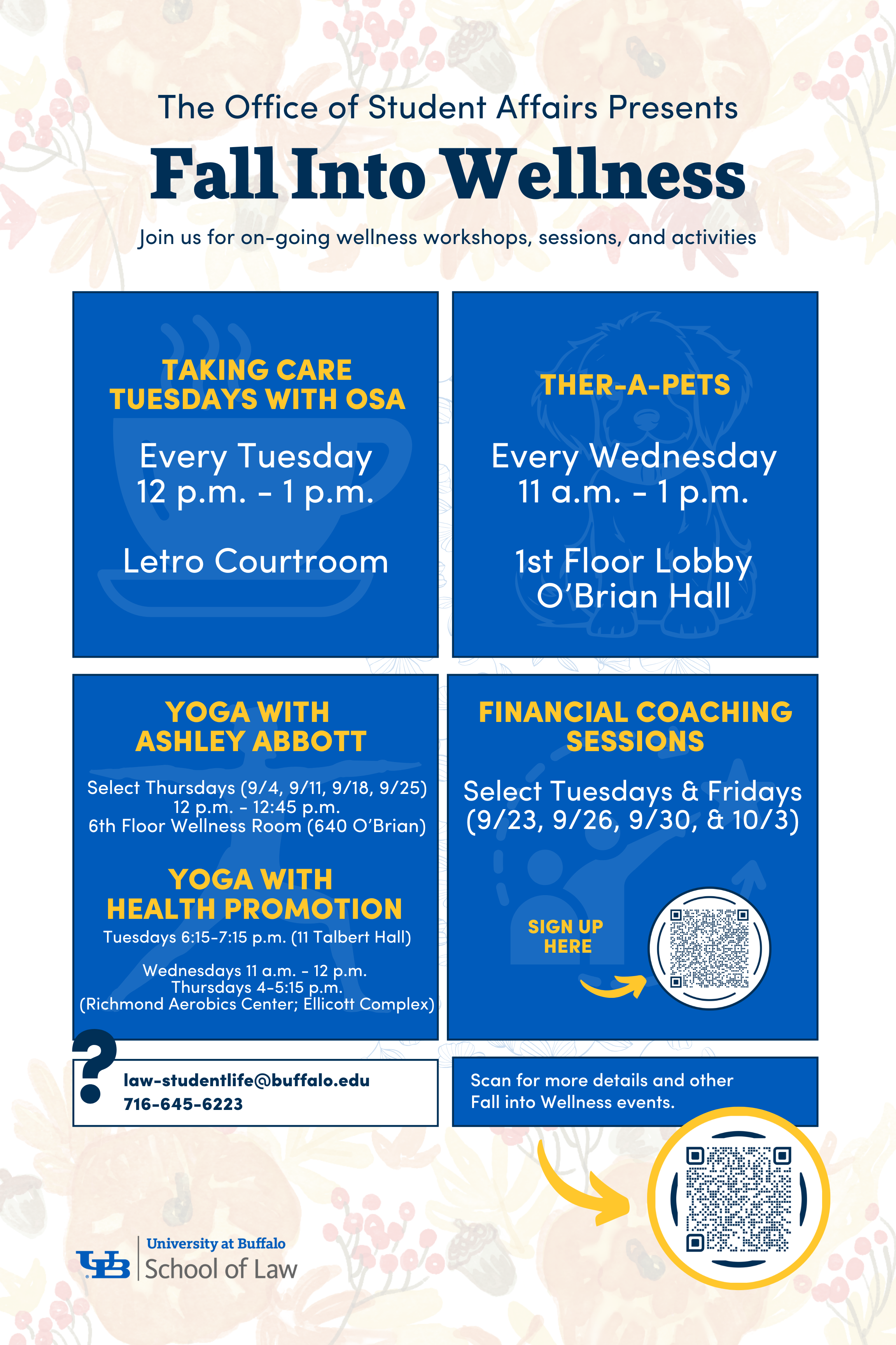 The Office of Student Affairs invites all JD/JSD/LLM students, faculty, and staff to our weekly and semesterly Fall 2025 Wellness Events.