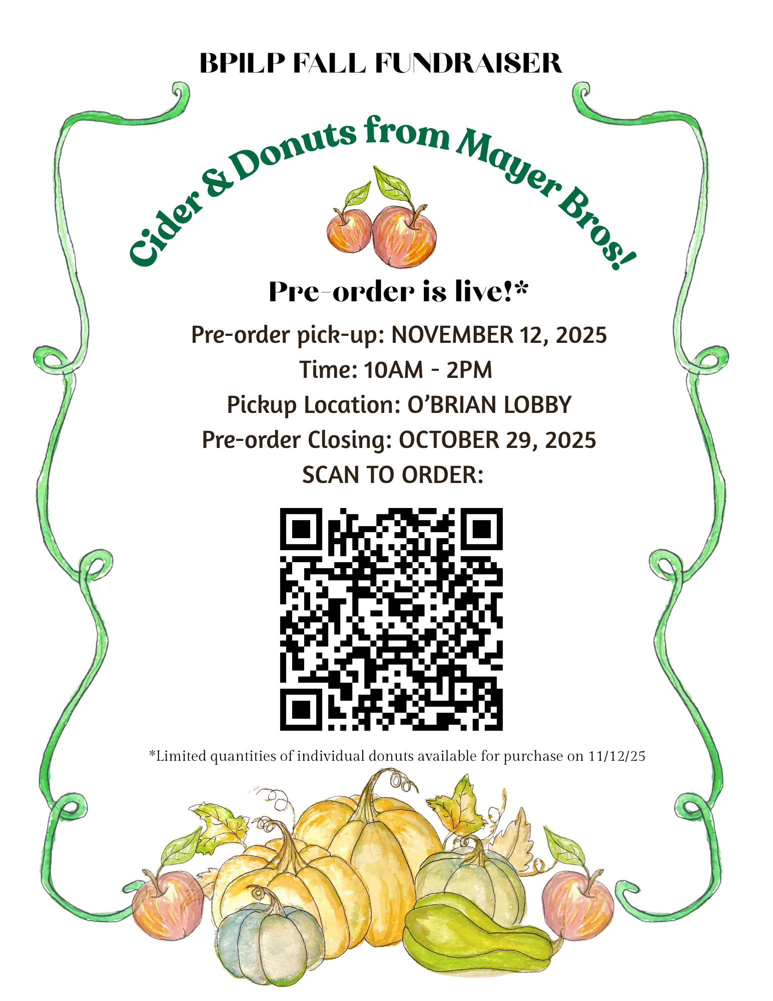 Support BPILP's fundraising efforts with some fall classic treats! We have partnered with Mayer Bros to bring you selections, including assorted cider donuts and apple cider! A portion of the proceeds from each sale directly benefits BPILP student fellowships!