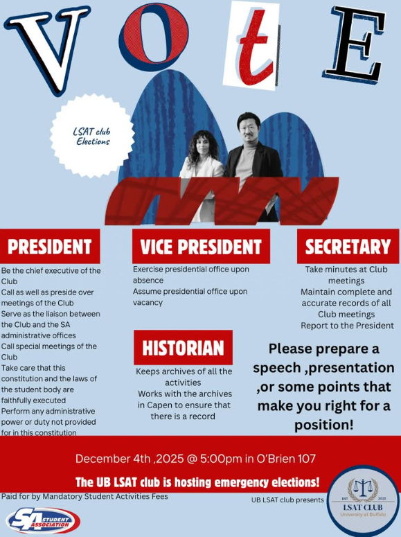 The UB LSAT Study Club is having a meeting this Thursday, 12/4 in O'Brian 107 from 5-6 pm