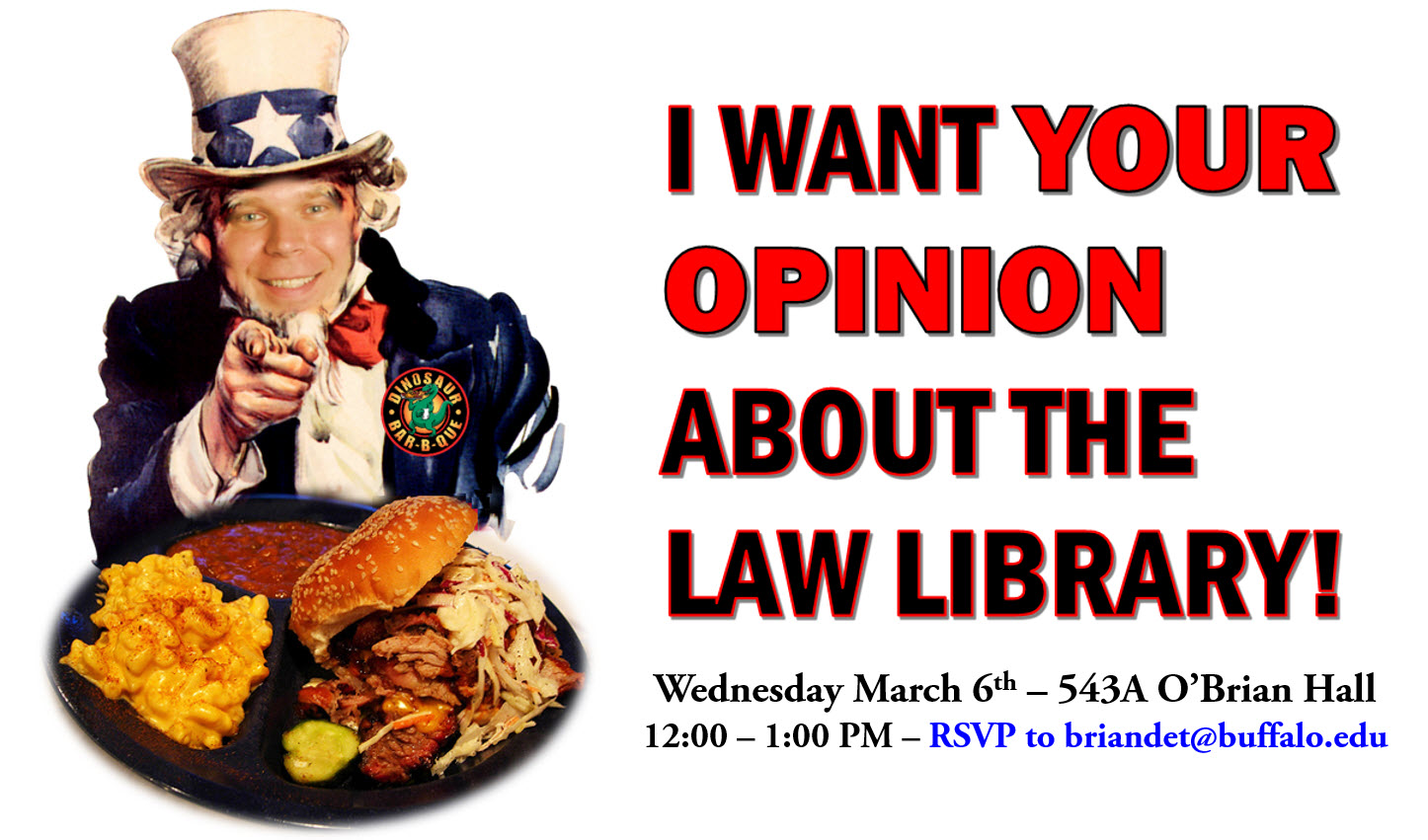 We will be holding our only Law Student Focus Group of the semester this Wednesday, March 6th from Noon to 1:00 PM in 543A O’Brian and we would love to hear your thoughts about the changes we have made and the exciting plans we have for the future! Also, as our way of saying thanks, all participants will receive free lunch from Dinosaur BBQ!!!