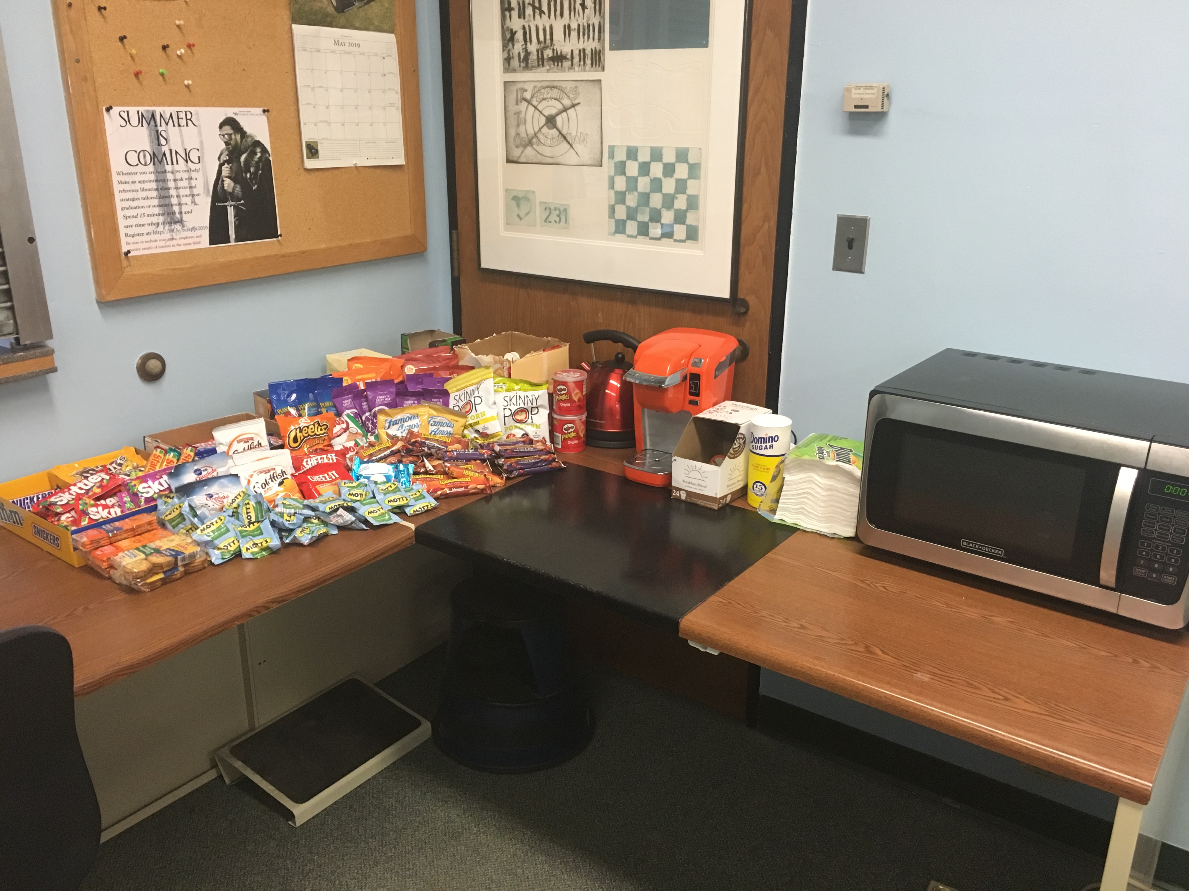 Also, we now have a student lounge just for you in Room 536 where you can use our microwave and Keurig or grab a snack while you are here. We have couches, tables and chairs, and are also working on getting a foosball table!! Best of luck with your studies. If the library can provide anything else to help make these next two months more productive, please let me know!