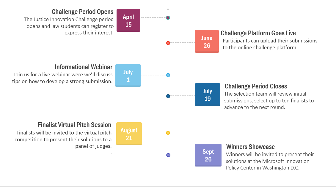 Please read the FAQs for students and Official Rules to answer any of your questions! If something is not clear, please contact the challenge coordinator, Miguel Willis at mwillis@lsac.org. The submission link on the Justice Innovation Challenge website will not go live until June 26th, so in the meantime, participants should prepare all their materials based on the requirements of the challenge and simply upload them when the platform goes live. Students should fill out this form to express interest, stay up to date, and receive a notification when the platform goes live!